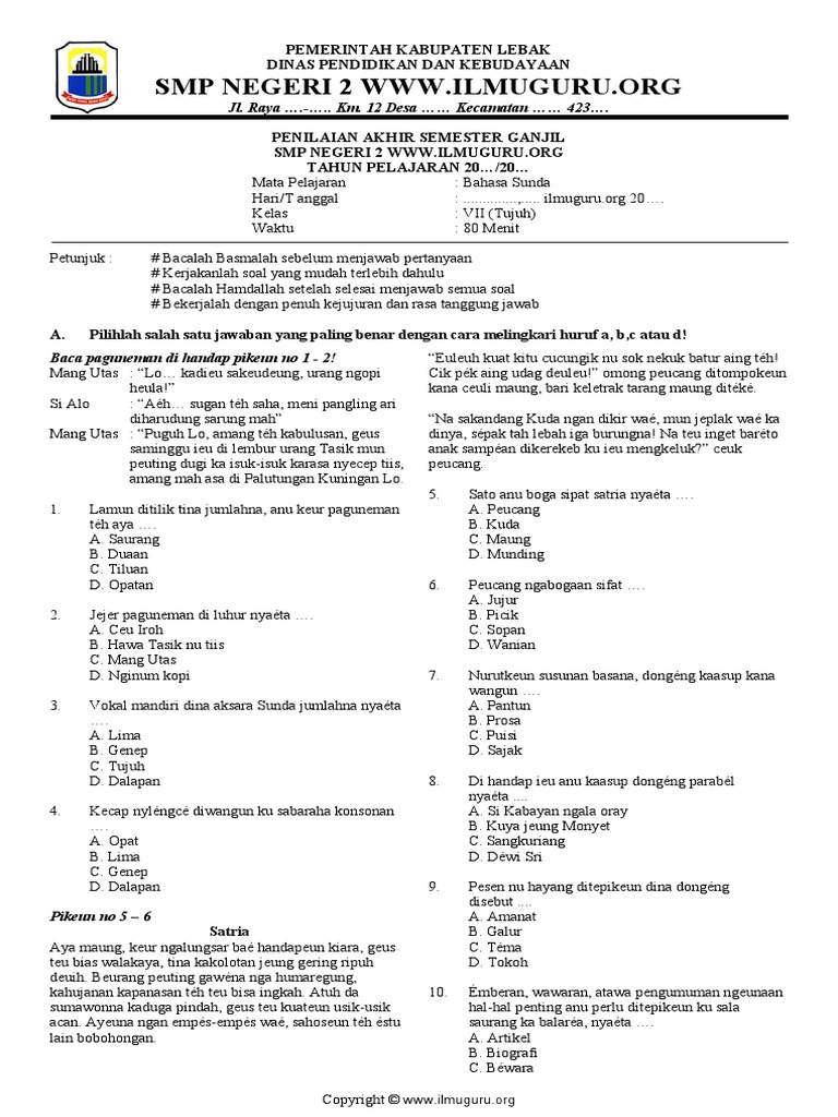 Bahasa Sunda, sebagai salah satu kekayaan budaya Indonesia, memiliki peran penting dalam membentuk identitas dan karakter masyarakat Jawa Barat. Pembelajaran bahasa Sunda di sekolah, khususnya di kelas 7 semester 1, menjadi fondasi awal bagi siswa untuk memahami, mengapresiasi, dan melestarikan bahasa serta budaya leluhurnya. Evaluasi pembelajaran melalui soal-soal ujian menjadi instrumen penting untuk mengukur tingkat pemahaman siswa dan efektivitas proses pembelajaran.