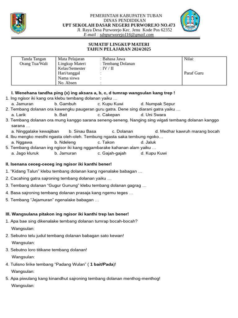Pembelajaran tembang dolanan di kelas 4 SD bukanlah sekadar menghafal lirik dan irama, melainkan sebuah perjalanan mendalam untuk menggali makna, pesan, dan keindahan bahasa di dalamnya. Soal-soal yang dirancang dengan baik dapat menjadi alat yang ampuh untuk menguji pemahaman siswa, mendorong mereka untuk berpikir kritis, dan menumbuhkan kecintaan terhadap warisan budaya ini. Artikel ini akan membahas secara mendalam mengenai berbagai aspek soal Bahasa Jawa kelas 4 yang berfokus pada tembang dolanan, mulai dari tujuan pembelajaran, jenis-jenis soal, hingga strategi pengembangannya.